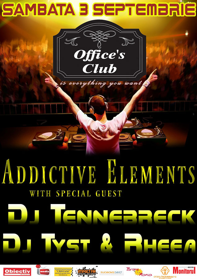 Addictive Elements Data03 sept. sâm 23:00AccessgratuitComentarii0Trackbacks0 Sâmbătă, 3 Septembrie 2011, Office’s Club Suceava te invită la Addictive Elements cu DJ Tennebreck și și DJ Tyst & Rheea. Tweet