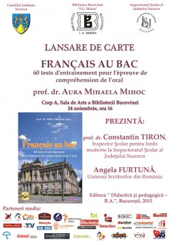 Marți, 24 Noiembrie 2015, începând cu ora 16:00, Biblioteca Bucovinei I. G. Sbiera Suceava te invită la lansarea cărții intitulată Français au BAC. 60 tests d’entraînement pour l’épreuve de compréhension de l’oral de Aura Mihaela MIHOC.