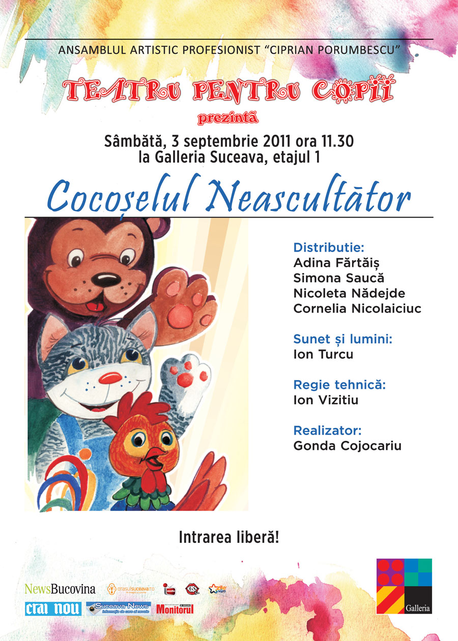 Sâmbătă, 2 Septembrie 2011, începând cu ora 11:30, Galleria Suceava te invită la spectacolul de teatru Cocoșelul Neascultător.