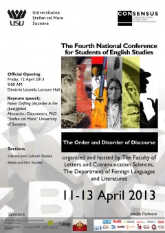 În perioada 12-13 Aprilie 2013, Departamentul de Limbi și Literaturi Străine al Facultății de Litere și Științe ale Comunicării din cadrul Universității Ștefan cel Mare Suceava te invită la cea de-a IV-a ediție a Simpozionului Național CONSENSUS (Conference for Students of English Studies at the University of Suceava), cu tema generală The Order and Disorder of Discourse (Ordinea și dezordinea discursului).