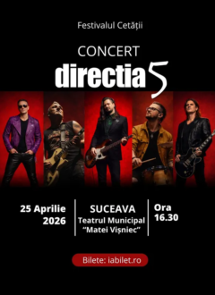 Sâmbătă, 25 Aprilie 2026, începând cu ora ora 16:00, respectiv 19:00 Cinema Modern din Suceava te invită la un concert Direcția 5 – Cultural Tour 2026.