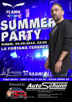 Vineri, 6 Septembrie 2019, începând cu ora 22:30, La Fontana Terrace Suceava din cadrul Iulius Mall te invită la Summer Party cu Dj Andi.