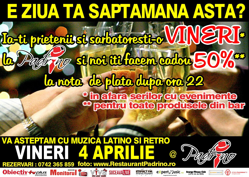 E ziua ta săptămâna asta? Ia-ți prietenii și sărbătorești-o la Padrino Suceava – beneficiezi de 50% reducere la nota de plată după ora 22:00.