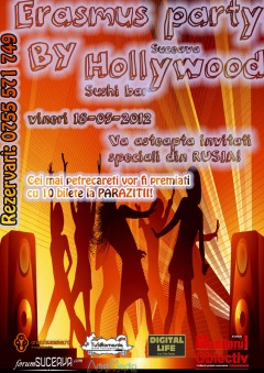 Erasmus Party Data18 mai vin 23:00LocHollywood Sushi Bar SuceavaComentarii0Trackbacks0 Vineri, 18 Mai 2012, începând cu ora 23:00, Hollywood Sushi Bar Suceava te invită la Erasmus Party. Tweet