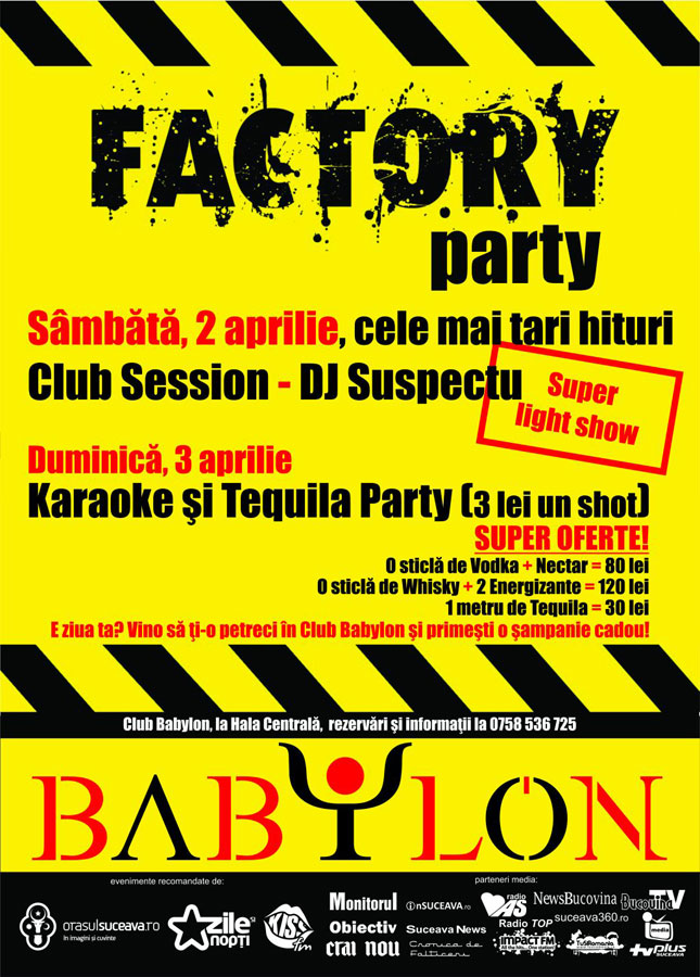 În perioada 2-3 Aprilie 2011, începând cu ora 22:00, Club Babylon Suceava te invită la Factory Party cu DJ Suspectu.
