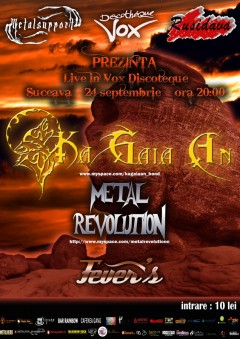 Vineri, 24 Septembrie 2010, începând cu ora 20:00, Discotheque Vox Suceava te invită la un concert cu trupele Ka Gaia An, Metal Revolution și Fever’s.