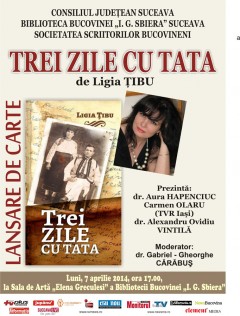 Luni, 7 Aprilie 2014, începând cu ora 16:00, la Biblioteca Bucovinei I. G. Sbiera Suceava va avea loc lansarea cărții Ligia ȚIBU – Trei zile cu tata.