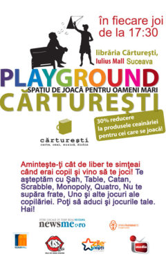Joi, 12 August 2010, începând cu ora 17:30, librăria Cărtureşti din Iulius Mall Suceava se transformă în spaţiu de joacă. De data asta unul pentru oameni mari!