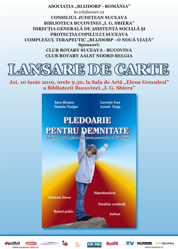 Joi, 10 Iunie 2010, începând cu ora 9:30, Biblioteca Bucovinei I. G. Sbiera Suceava te invită la lansarea cărții Pledoarie pentru demnitate – aspecte practice privind recuperarea persoanelor cu dizabilități (Sindrom Down, Hiperkinetism, Paralizie cerebrală, autism, retard psihic).