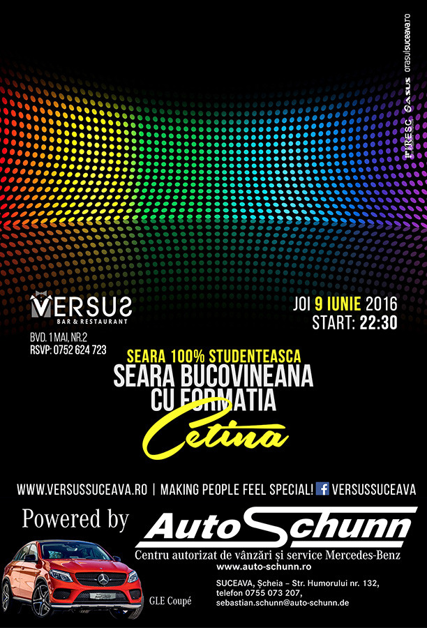 Seară bucovineană cu formația Cetina Data09 iun. joi 22:30LocVERSUSComentarii0Trackbacks0 Joi, 9 Iunie 2016, începând cu ora 22:30, VERSUS te invită la o seară bucovineană cu formaţia Cetina. Tweet