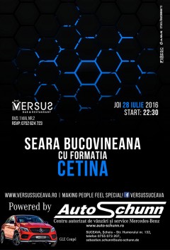 Seară bucovineană cu formația Cetina Data28 iul. joi 22:30LocVERSUSComentarii0Trackbacks0 Joi, 28 Iulie 2016, începând cu ora 22:30, VERSUS te invită la o seară bucovineană cu formaţia Cetina. Tweet