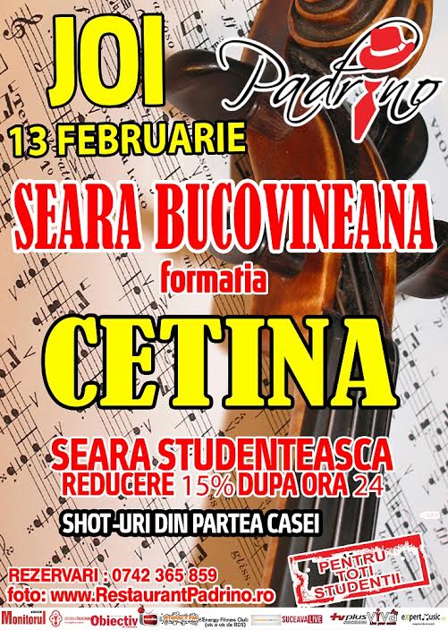 Joi, 13 Ianuarie 2014, începând cu ora 22:00, Padrino Suceava te invită la o seară bucovineană cu formaţia Cetina (Suceava).