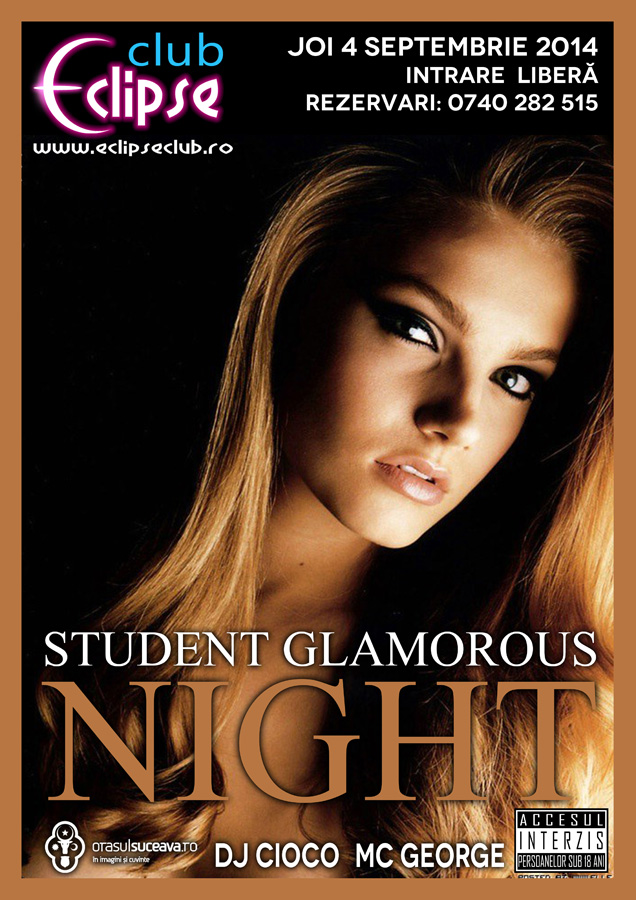Student Glamorous Night Data04 sept. joi 22:00AccessgratuitComentarii0Trackbacks0 Joi, 4 Septembrie 2014, începând cu ora 22:00, Club Eclipse White Sensation Suceava te invită la petrecerea intitulată Student Glamorous Night cu DJ Cioco și MC George. Tweet