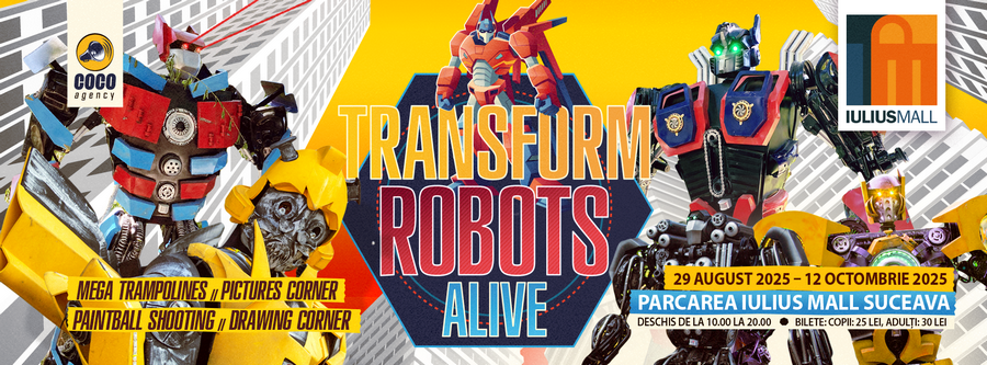Până pe data de 12 octombrie 2025, în parcarea Iulius Mall Suceava, ai ocazia să „faci cunoștință” cu 14 modele de roboți animatronici, care ajung și până la 6 metri înălțime, cunoscuți pentru abilitățile impresionante și puterea cu care au cucerit teritorii SF și atenția fanilor curioși din toată lumea. O serie de activități dedicate celor mici vor face expoziția și mai atractivă: trambulină, paintball, photo corner și un colț creativ de desenat sunt surprizele puse la cale de organizatori.