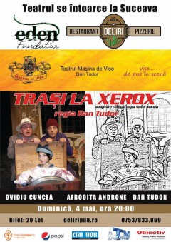 Trași la Xerox Data04 mai Dum 20:00Access20 leiComentarii0Trackbacks0 Duminică, 4 Mai 2014, începând cu ora 20:00, Del’Iri Pub Suceava te invită la spectacolul de teatru Trași la Xerox. Tweet
