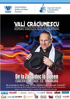 Joi, 29 Octombrie 2015, începând cu ora 19:00, Auditoriumul Joseph Schmidt din cadrul Universității Ștefan cel Mare Suceava te invită la un concert susținut de Vali Crăciunescu, Adrian Maciuca și Dan Blueman.