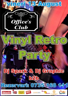 Vinyl Retro Party Data13 aug. vin 23:00AccessgratuitComentarii0Trackbacks0 Vineri, 13 August 2010, începând cu ora 23:00, Office’s Club Suceava te invită la Vinyl Retro Party cu DJ Spark și DJ Graphic. Tweet