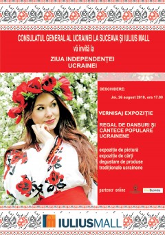 Ziua Independenţei Ucrainei va fi sărbătorită în Iulius Mall Suceava joi, 26 August 2010, începând cu ora 17:00, când oficialităţi locale şi ucrainene, diplomaţi şi artişti din ambele ţări vor asista la un spectacol inedit.